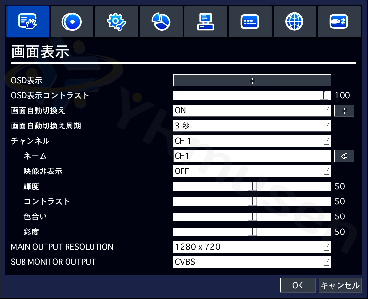 AHD2.0:1920×1080、1920×540、1280×720、640×360 AHD1.0:1280×720、640×360 アナログ:960H、D1、CIF |