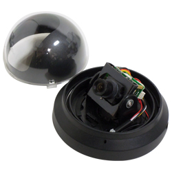 レンズはf3.6mmと標準のレンズを採用していますが、CCDサイズが1/3インチなので、水平画角約67度と比較的ワイドエリアを監視可能です。人相が確認出来る距離は約5m程度までとなりますのでカメラ設置場所より手前全体を監視したい場合に適していると言えます。なお、レンズは小型カメラミニレンズに交換可能ですが、広角にした場合はドームカバーに装着されているスモークカバーに映像が被ってしまう為、広角レンズへの交換はお奨めできません。(内部のスモークカバーを外すことで対応は可能です)