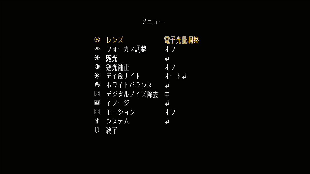 主な撮影機能として明暗差の激しい場所で安定した映像を得ることが出来るWDR機能を始め、蛍光灯のチラツキを完全抑制するフリッカレス機能、色温度の調整が出来るホワイトバランス機能、低照度下のノイズを軽減させる3DNR機能等、画質を安定させる為の様々な機能を搭載。また、プライバシー保護用のマスキングや、動体検知機能、画像の上下左右反転機能、カメラタイトル表示なども搭載しており必要な機能はほぼ兼ね揃えています。また、これらの各機能はOSD設定機能によりモニター画面にメニューを表示させて設定することができます。メニュー表示は日本語となっており、多彩な機能もスムーズに設定していただくことができます。