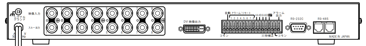 | アラーム機能 | アラーム入力チャンネルの単画面表示 アラーム動作時、信号出力 アラーム保持モード:INTERNAL / EXTERNAL 検出接点:MAKE / BREAK INT.保持時間:約3~999秒に可変 アラーム解除後動作:戻る/そのまま アラーム画面表示:ON/OFF |